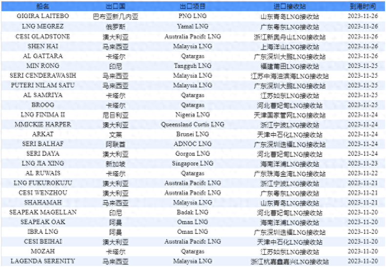 表1:11月20日-11月26日中国LNG进口分析